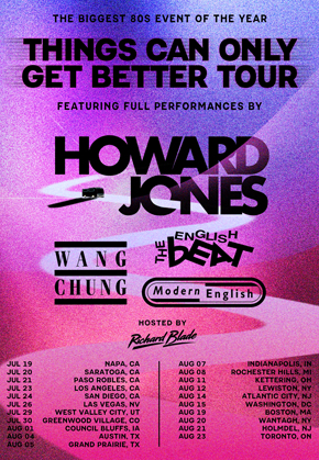 I’m Thrilled to announce the “Things Can Only Get Better” North American tour is coming to a city near you this summer! Howard Jones with support from fellow British 80s greats Wang Chung, The English Beat, Modern English and will be hosted by SiriusXM’s Richard Blade. Tickets go live Friday April 10th, more tour dates will be announced shortly.